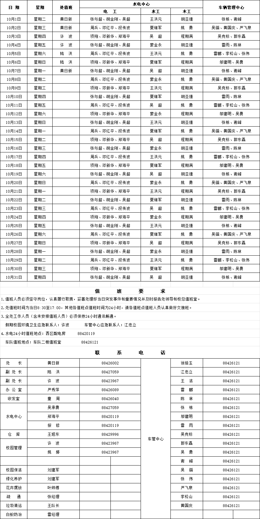 总务处2024年10月(国庆节)值班表