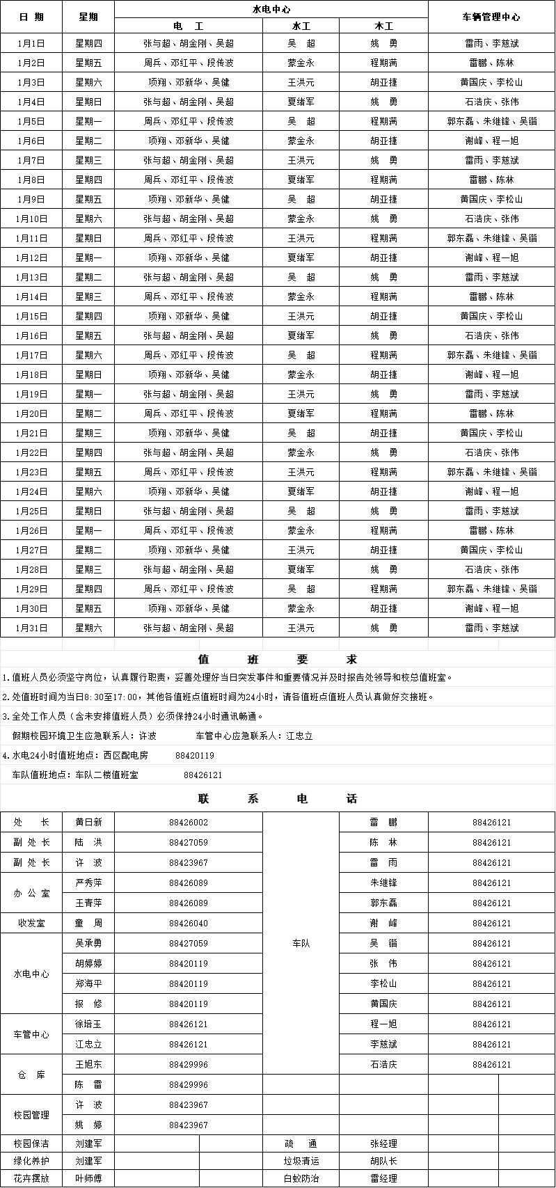 总务处2026年1月(元旦)值班表