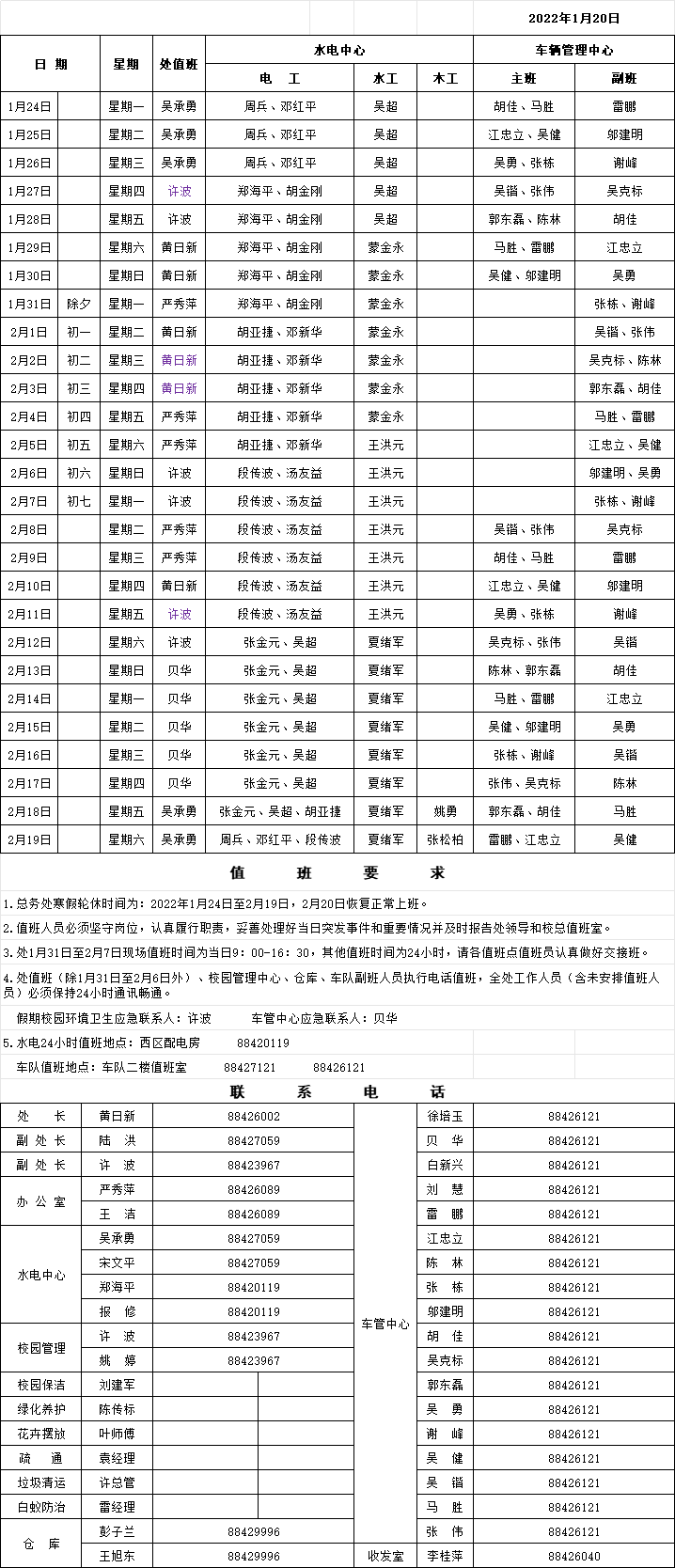 总务处2022年寒假(2月)值班表