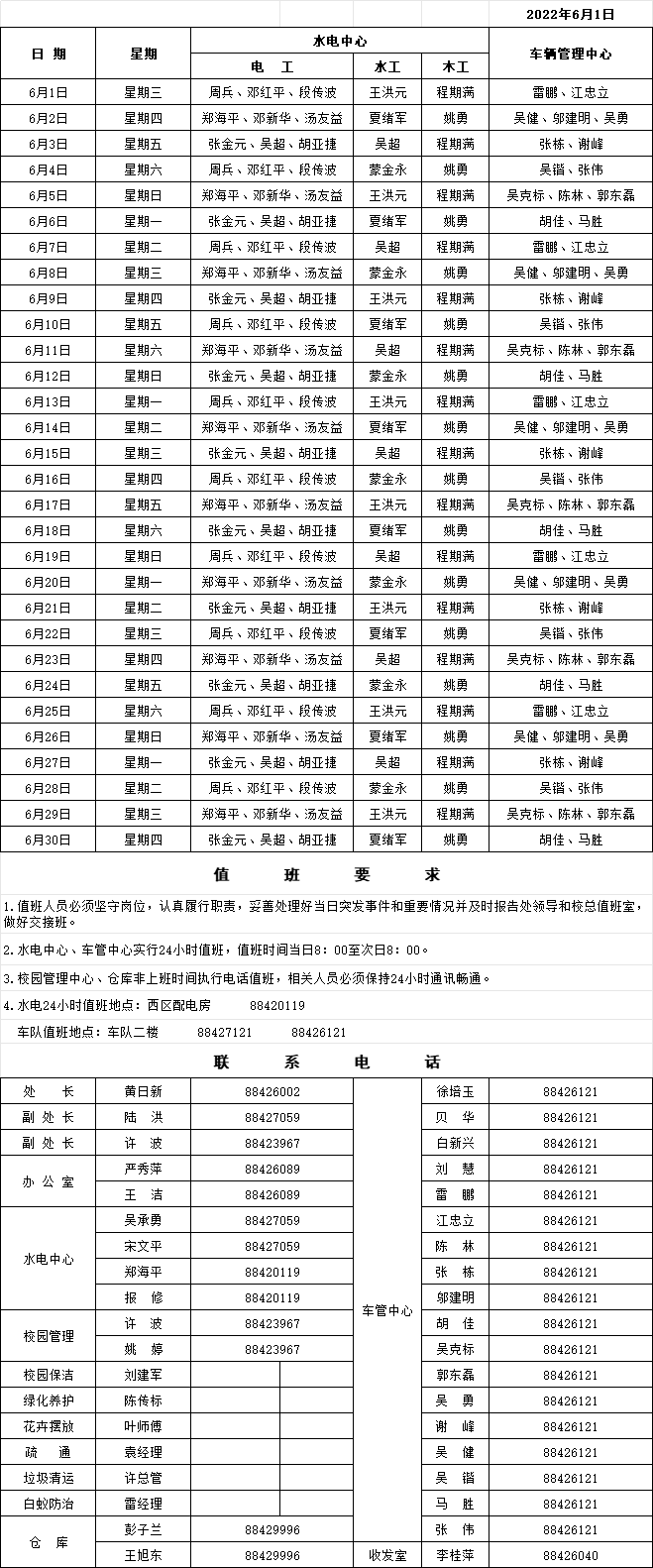 总务处2022年6月(端午节)值班表
