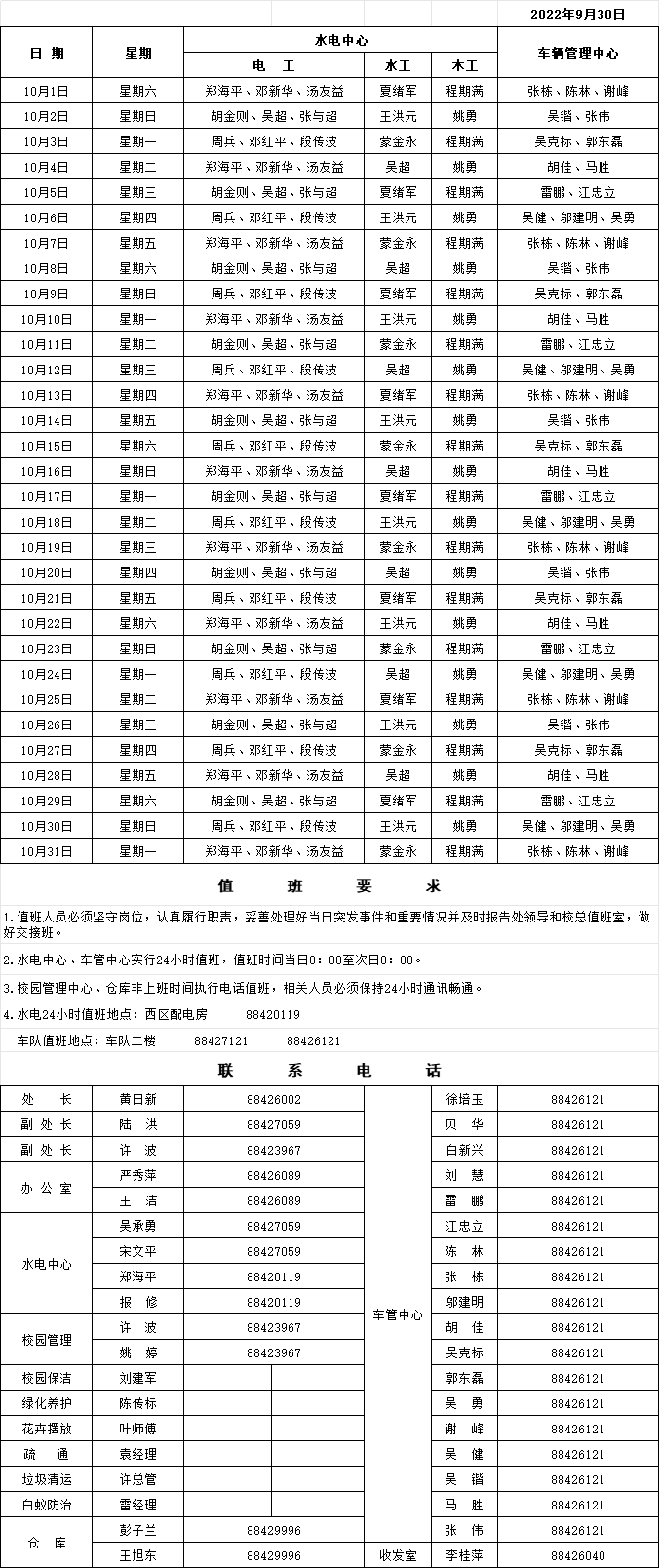 总务处2022年10月(国庆节)值班表