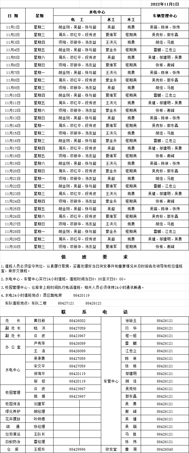 总务处2022年11月值班表